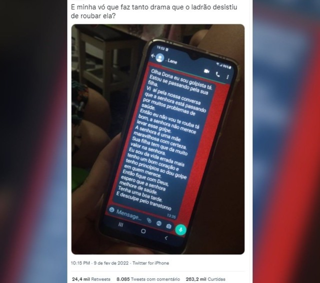 Um homem tentou aplicar um golpe em uma idosa, em Lençóis Paulista, mas desistiu de roubar a mulher ao perceber que ela enfrentava problemas de saúde. Diante do fato, a neta da idosa, Laís Biagi, resolveu postar a mensagem em sua rede social, na última quarta-feira (9), e a postagem viralizou nas redes sociais.