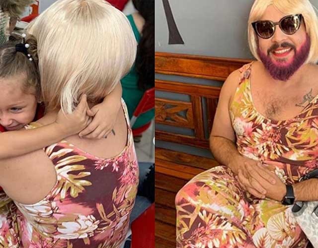 “Todo Dia das Mães é extremamente delicado para ela. Mas dessa vez ela falou: ‘Papai. Estamos ensaiando uma música para o Dia das Mães, mas eu não tenho mamãe. Minha mãe foi morar com Papai do Céu’. Foi então que ela me pediu que eu fosse a mamãe dela por um dia na festa. Ela queria que eu fosse de barba rosa e peruca loira”, contou Daniel ao G1.