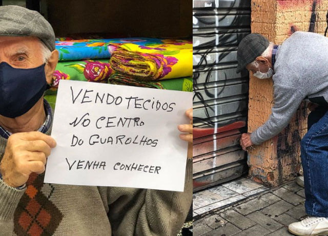 “O sr. Youssef é um comerciante libanês de 91 anos que esbanja simpatia pelas ruas do Centro de Guarulhos. Por conta da pandemia, ficou com a loja fechada, mas nunca perdeu a fé por dias melhores. Agora, com a retomada do comércio, ele está de volta com tecidos de qualidade e lindas estampas, inclusive para máscaras. Convidamos você a vir conhecer, levar um corte e compartilhar esse post numa grande corrente do bem!”.
