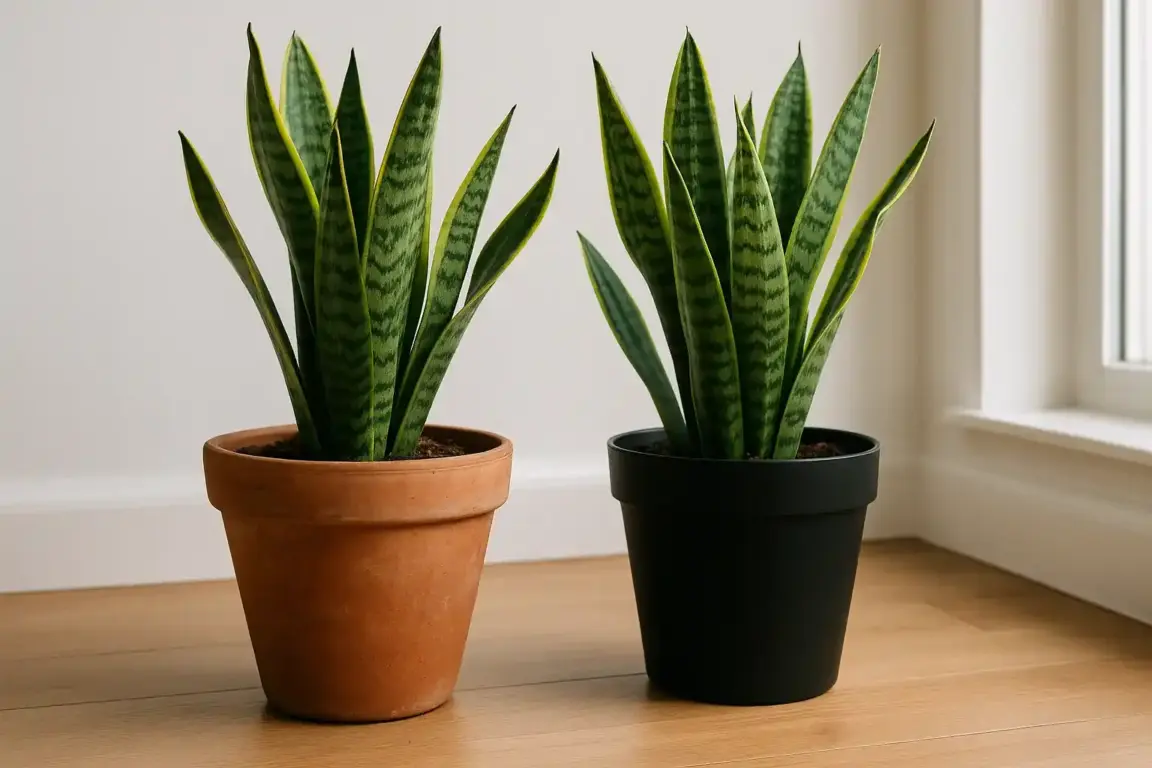 Se sua espada-de-são-jorge está dentro de casa, longe do sol direto, em ambiente com ar-condicionado ou calefação, o vaso de plástico pode ser a melhor escolha — ele reduz a perda de água e mantém o solo úmido por mais tempo.