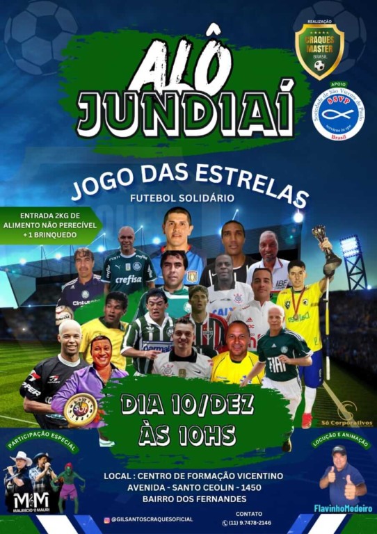 Neste domingo (10), Jundiaí receberá a partida solidária Futebol das Estrelas, a partir das 9h no Centro de Formação Antonio Frederico Ozanam. O jogo acontecerá em prol dos vicentinos de Jundiaí.