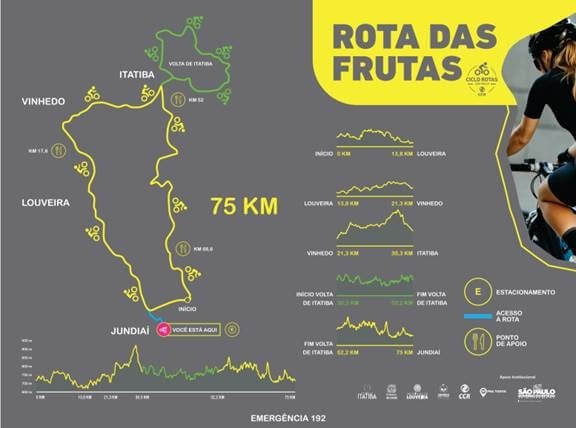 O Grupo CCR, companhia de infraestrutura orientada para mobilidade humana, em parceria com o Governo do Estado de São Paulo, lança mais um Ciclo Rota São Paulo CCR, a Rota das Frutas, no próximo sábado(29). O trajeto de 75 quilômetros, de nível desafiador, passa pelas cidades de Jundiaí, Louveira, Vinhedo e Itatiba.