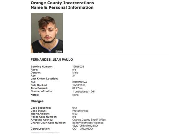 A ficha do jogador já consta no sistema do Departamento de Correções do Condado de Orange, na Flórida. Ele foi fichado às 7h27 (9h27 horário de Brasília).