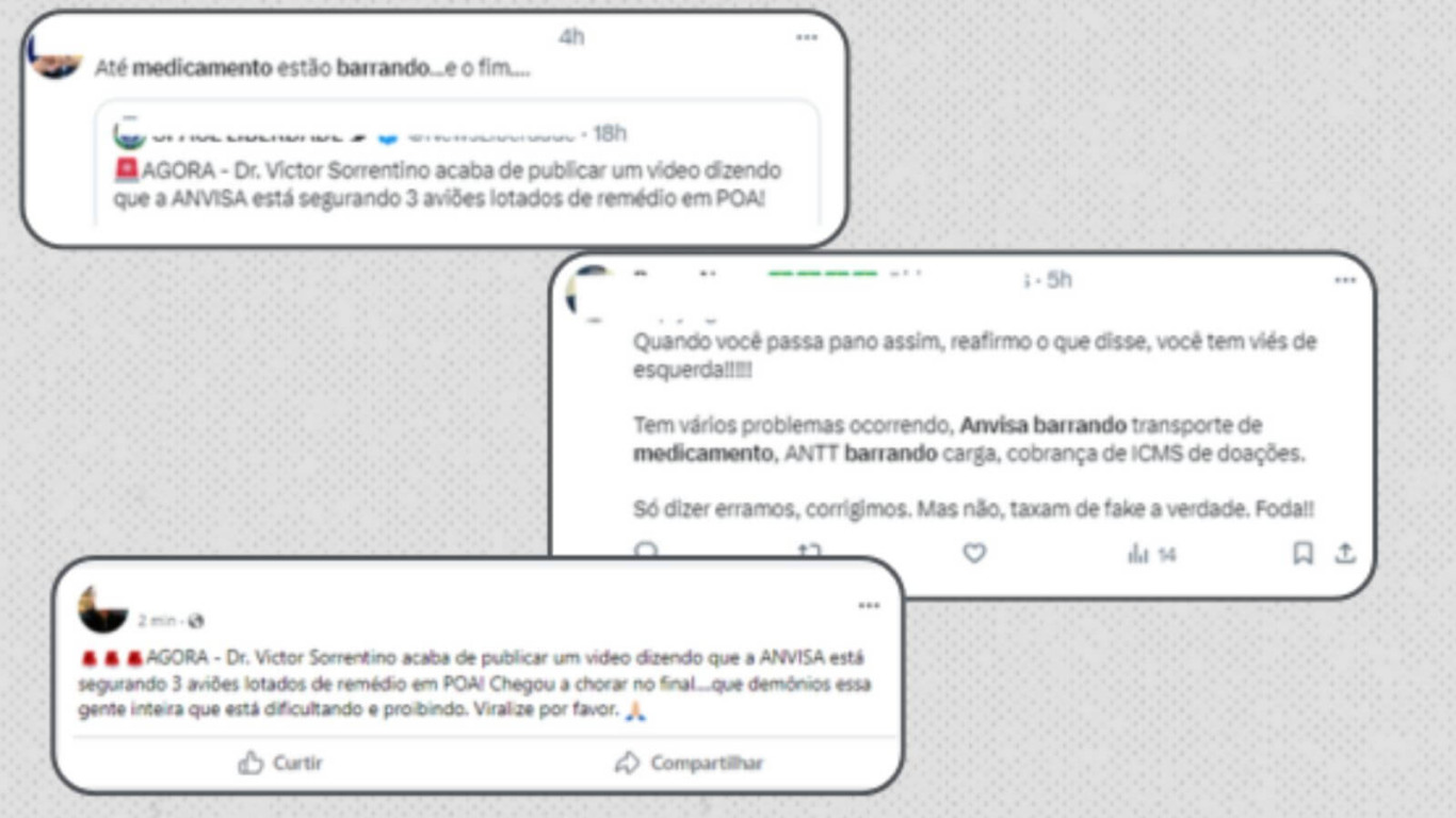 Os conteúdos desinformativos sobre a suposta proibição de envio de remédios ao Sul do país viralizaram depois que um médico gaúcho, Victor Sorrentino, publicou um vídeo no qual pede que a Anvisa desburocratize o transporte de produtos de saúde.