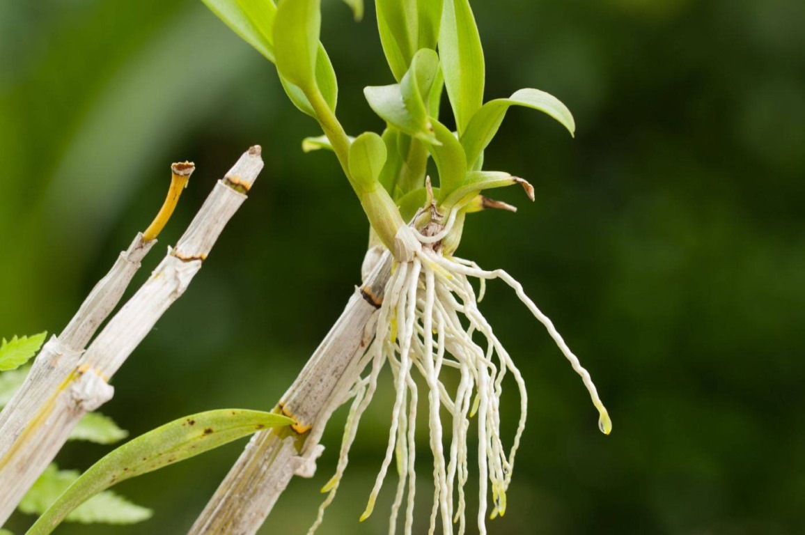 Outro método simples para fazer muda de orquídea é pelo caule, mas para isso, é preciso que ele esteja com uma raiz brotando. Neste caso, é só removê-lo da planta original e colocá-lo em um novo vaso já preparado com substrato próprio para orquídeas. Se necessário, coloque uma vareta ou outro apoio para sustentar a nova mudinha.