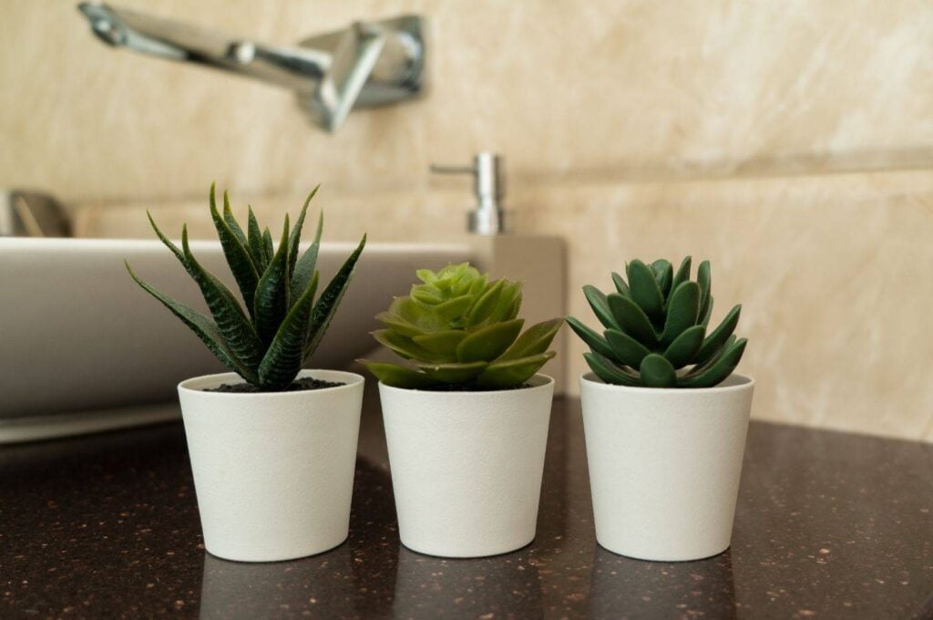 Suculentas são plantas ideais para ambientes com luz direta ou indireta. Elas vêm em diversas formas e cores, proporcionando uma variedade de opções para decorar seu banheiro com um toque moderno e elegante.