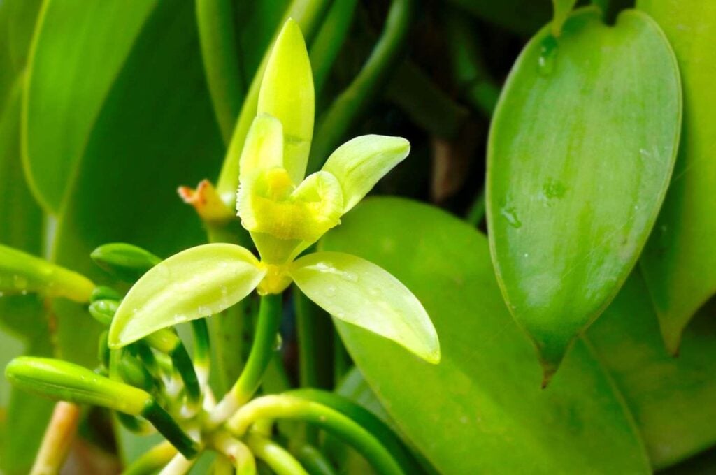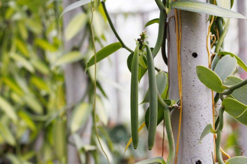 A baunilheira pode chegar a mais de 10 metros de comprimento, possui flores verde-amareladas e seus frutos são vagens de 10 a 25 centímetros, de onde se extrai a tão cobiçada baunilha.