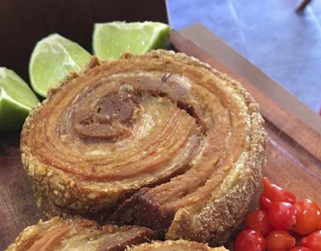 Para acompanhar o torresmo de rolo, o estabelecimento oferece de acompanhamento pimenta biquinho e fatias de limão. Aí, é só o cliente se esbaldar.