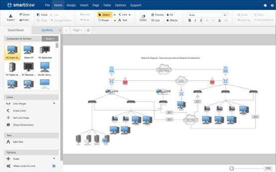Apesar da interface pouco intuitiva, ele permite que você crie diagramas de fiação, projetos de circuitos, diagramas lógicos, diagramas de blocos, planos de fiação residencial e comercial, e ainda importe arquivos e estêncil do Visio. Além disso, Fluxogramas e mapas mentais são ridiculamente fáceis de fazer com o SmartDraw – sem arrastar e soltar e ajustar linhas e formas para serem perfeitamente centralizadas/alinhadas umas com as outras, basta usar a automação e o programa sabe adicionar a quantidade exata de espaço e alinhamento para fazer um diagrama muito claro e compreensível.