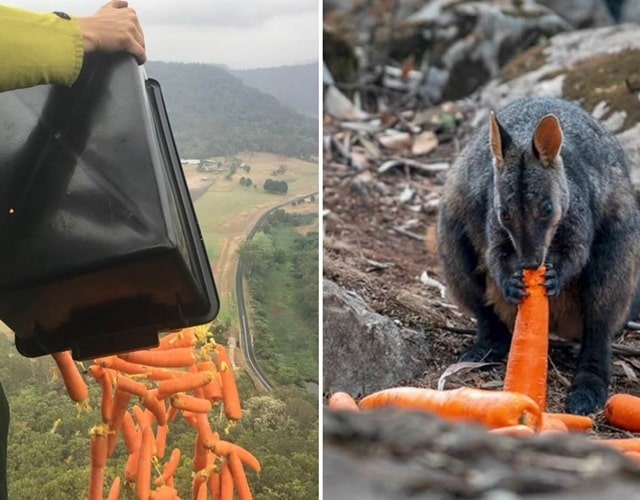 No último sábado (11), um grupo lançou de um helicóptero milhares de quilos de cenouras e batatas para alimentar cangurus, wallabies e outras espécies.