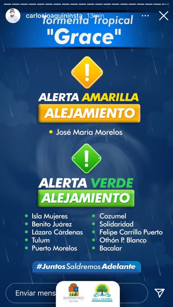 “Temos faixas de nuvens e ventos fortes. O total de pessoas evacuadas chegou a 337, principalmente na área de Felipe Carrillo Puerto e Tulum, sem perdas humanas a se lamentar”, informou o governador Carlos Joaquín, através do Facebook.