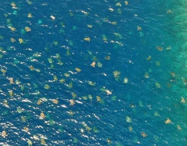 Um drone flagrou cerca de 64 mil tartarugas marinhas verdes que se preparavam para fazer “ninhos” perto da Grande Barreira de Corais da Austrália, em Raine Island, considerada a maior colônia da espécie.
