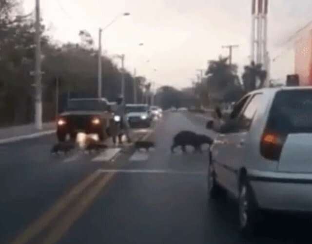 O registro foi feito pela médica veterinária especializada em animais silvestres Danny Moraes. De acordo com ela, os veículos pararam para que os animais pudessem atravessar a avenida.