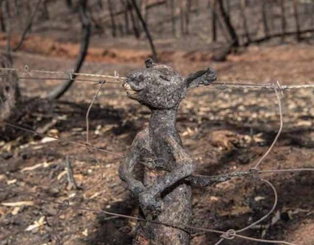 Entre esses animais, um deles chamou atenção: um filhote de canguru registrado pelo fotógrafo Brad Fleet, do jornal local “The Advertiser”. Preso em uma cerca de arames e carbonizado, a imagem repercutiu nas redes sociais de todo o mundo e ilustrou a tragédia causada pelos incêndios no país.