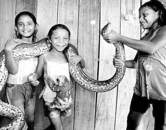 Eduardo diz que as três irmãs pegavam a sucuri com enorme destreza, sem medo algum. O animal, que costuma viver em regiões alagadas como a da Amazônia, pode chegar a medir seis metros.