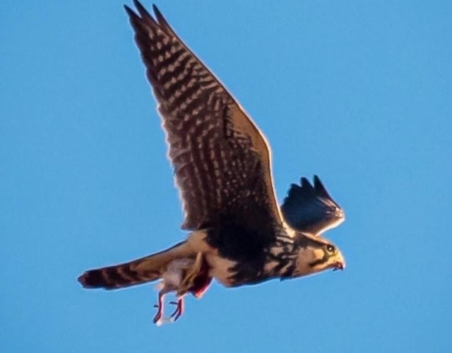 O fotógrafo Tercio Esperandio fez um registro espetacular com a sua câmera: ele conseguiu flagrar um falcão-de-coleira carregando uma presa (provavelmente outra ave) em pleno voo.
