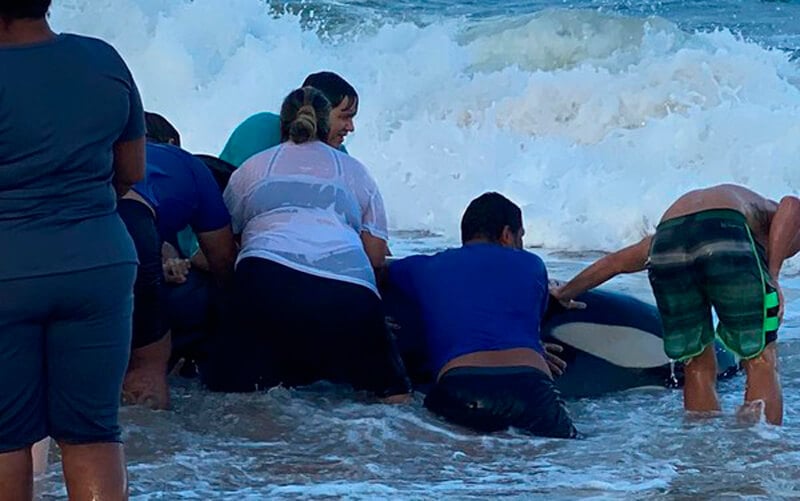 Alguns banhistas tentaram ajudar o animal a voltar para o mar e conseguiram levá-lo até um banco de areia. Segundo representantes do Projeto Mamíferos do Mar e do Projeto Baleia Jubarte, apesar de bastante debilitada, a orca deverá se desencalhar nas próximas horas.