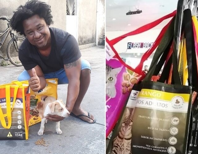 Pensando em ajudar, o carioca teve a ideia de pegar sacos de rações vazios e transformá-los em bolsas. O teste do acessório foi realizado por sua noiva que fez compras no mercado com a bolsa.