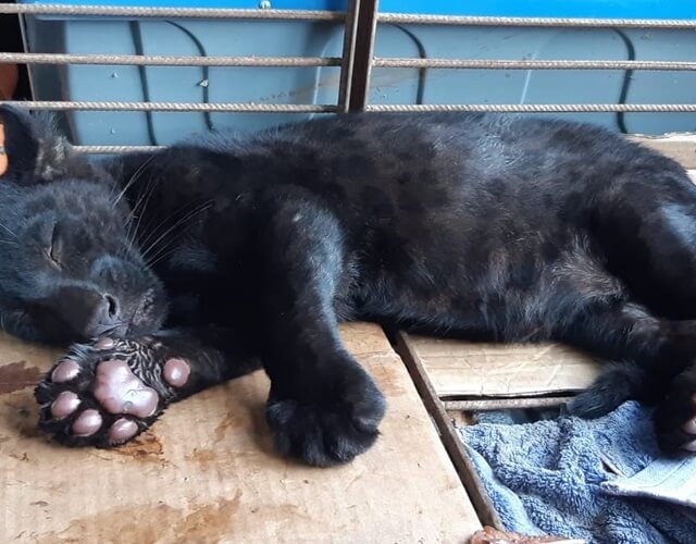 Um filhote de onça-pintada melânica foi resgatado no município de Paranaíta, a 849 quilômetros de Cuiabá (MT), na última quinta-feira (13). Segundo a equipe da Secretaria Estadual de Meio Ambiente (Sema), que fez o resgate, o animal de cerca de três meses é macho, estava sem mãe e muito fraco.