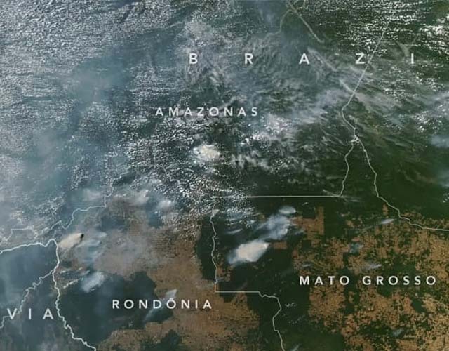 “O moderado espectrorradiômetro de imagens de resolução (Modis) do satélite Aqua capturou as imagens de vários incêndios ocorridos nos estados de Rondônia, Amazonas, Pará e Mato Grosso, ao longo de agosto”, ressalta a agência espacial.
