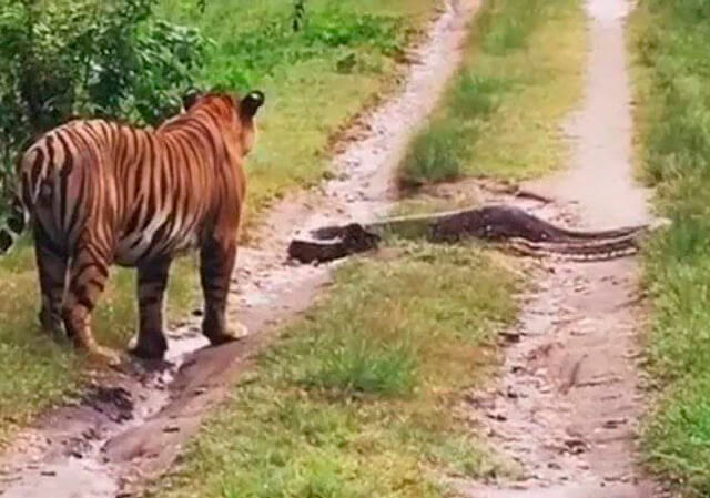 O vídeo que mostra um tigre desviando de uma píton, ao invés de atacá-la, voltou a viralizar nas redes sociais.