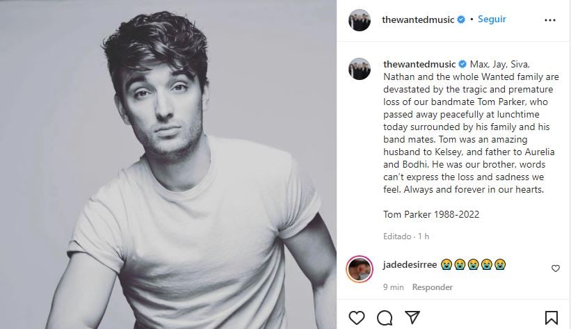 “Max, Jay, Siva, Nathan e toda a família Wanted estão devastados pela perda trágica e prematura de nosso colega de banda Tom Parker, que faleceu pacificamente na hora do almoço hoje cercado por sua família e seus companheiros de banda. Tom foi um marido incrível para Kelsey e pai para Aurelia e Bodhi. Ele era nosso irmão, palavras não podem expressar a perda e tristeza que sentimos. Sempre e para sempre em nossos corações”, escreveram.
