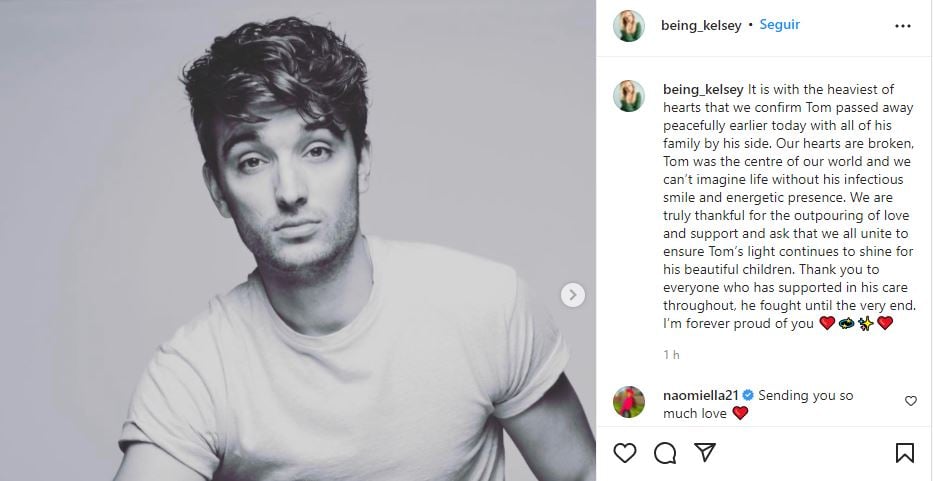 “É com o coração mais pesado que confirmamos que Tom faleceu pacificamente hoje cedo com toda a sua família ao seu lado”, escreveu. Ela continua: “Nossos corações estão partidos, Tom era o centro do nosso mundo e não podemos imaginar a vida sem seu sorriso contagiante e presença energética. Estamos realmente gratos pela demonstração de amor e apoio e pedimos que todos nos unamos para garantir que a luz de Tom continue a brilhar para seus lindos filhos. Obrigada a todos que apoiaram em seus cuidados durante todo o tempo, ele lutou até o fim. Estou sempre orgulhosa de você”, completou.