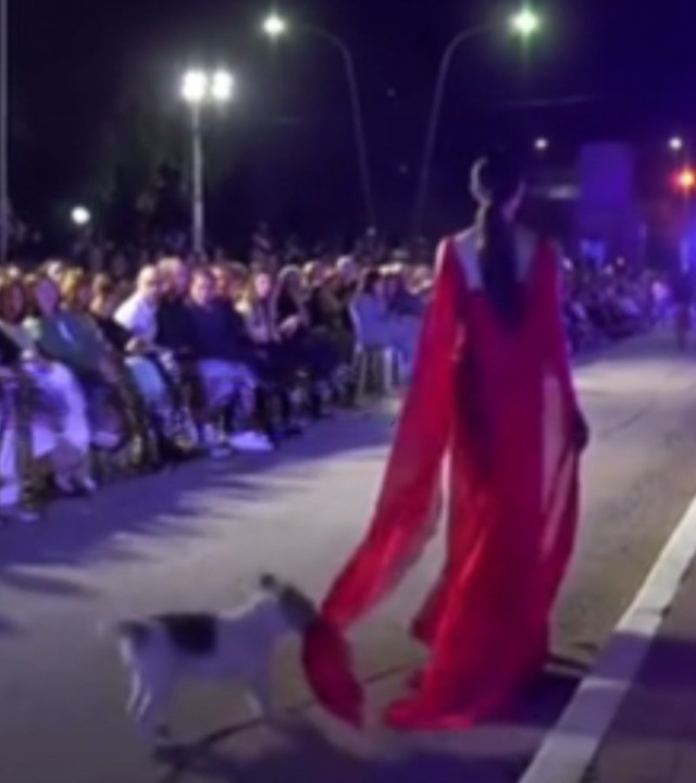 A modelo Katty Wu Chu demonstrou profissionalismo e leveza ao lidar com a situação inesperada. Sem perder o ritmo, ela manteve a postura e seguiu desfilando enquanto o filhote insistia em puxar seu vestido.