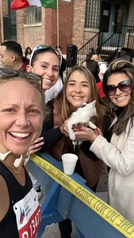 A partir daí, a prioridade da atleta foi o bem-estar do filhote de gato assustado. Ela diminuiu o passo para caminhar para que ele não fosse empurrado. “Aquele gato se tornou minha responsabilidade”, disse ela. “Eu precisava lhe dar o amor que ele merecia”.