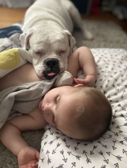 Finn e Brutus gostam de tirar um cochilo juntos, e às vezes o filhote subia na cama do bebê e ficava lá com muito cuidado. Agora, Finn já tem uma cama grande, mas prefere ir aonde quer que seu amigo peludo esteja.