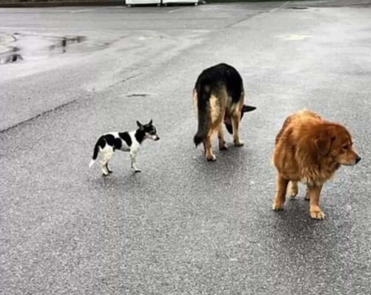 Lá, o golden retriever encontrou outros dois cachorros abandonados – um pastor alemão e um Chihuahua e começou a segui-los por aí.