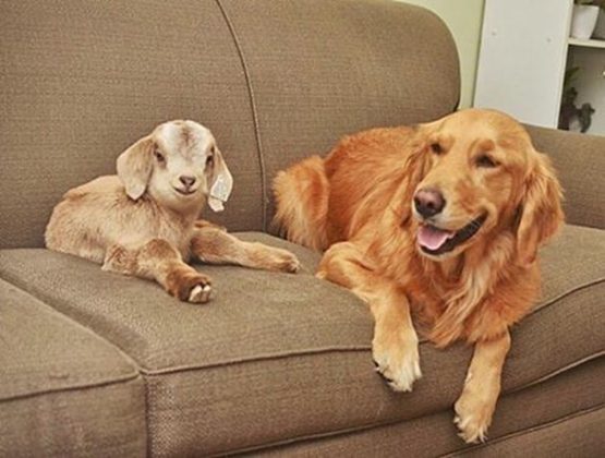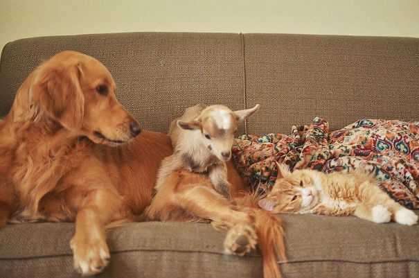 Vivendo na fazenda da norte-americana Andrea Holley, Loryn, da raça Golden Retriever, desde filhote está acostumada a conviver com os mais variados tipos de bichos da propriedade, e com isso, a cachorra acolheu dois filhotes de cabra que também residem na fazenda.