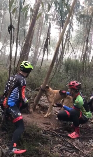 Nesta situação, o cachorro estava obviamente estressado e com muito medo. Aparentemente, o pet já suportava a mesma posição há algum tempo. Então, para ganhar sua confiança, os ciclistas lhe deram comida.