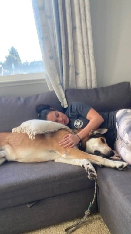 “S’mores é muito inteligente, bobo, feliz, sociável e curioso”, disse Sarah. “Ele adora o treinamento e o aprendizado de novas habilidades, fazer caminhadas e aventuras com sua família adotiva e ficar abraçado. Esse lindo garoto adora fazer parte da festa, sempre. Ele adora estar ao seu lado, seja no trabalho ou na ginástica, cozinhando, escovando os dentes ou se aconchegando no sofá.”