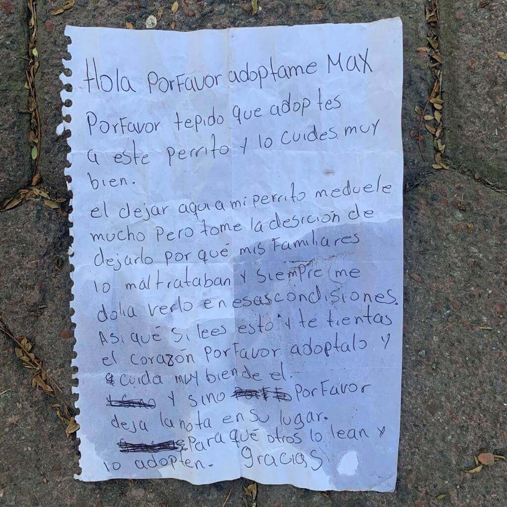 A nota, que pela letra parecia ter sido escrito por uma criança, contava que Max (o cachorro) era maltratado em casa, e pedia para que alguém de bom coração o adotasse.