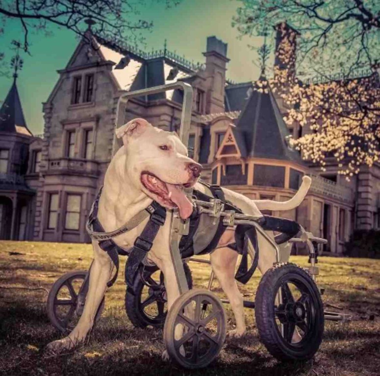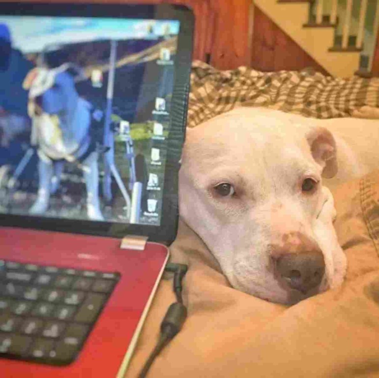 Mel é um pitbull de resgate de 8 anos de idade que tem uma doença neurológica que afeta o seu equilíbrio. A doença não é nada dolorosa – apenas torna a movimentação um pouco desafiante.