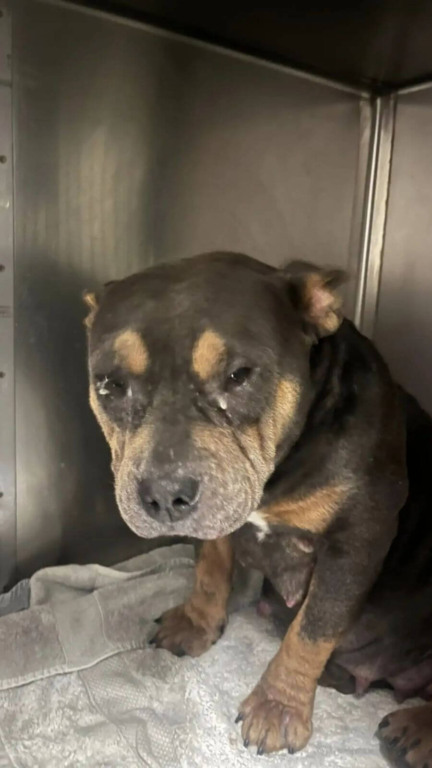 O rottweiler olhou para o homem com os olhos cheios de desespero. Ele mal conseguia se levantar, mas estava muito feliz por finalmente terem o encontrado.