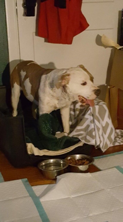 De acordo com Patti Dawson, o cachorro, que agora se chama Camilla, estava aterrorizado. “Ela estava basicamente enrolada no fundo do caixote”, disse. “Você podia tocá-la, mas ela estava congelada de medo. Não fazia contato visual, mantinha a cabeça baixa. Se você se aproximasse dela, ela colocava a cabeça para trás, tipo, ‘Não olhe para mim, não faça contato visual comigo, não me toque’. Fique longe'”.
