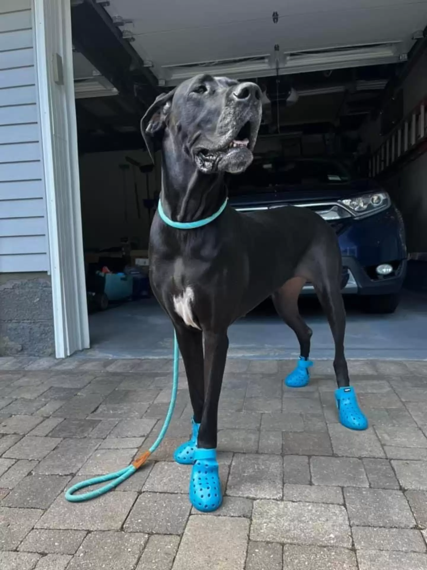 Hooch é um cão gigante completamente apaixonado por usar ‘crocs’. Primeiro ele usava apenas para proteger as patas durantes os passeios ou para fazer fotos, agora, não tira mais o sapatinho do pé.