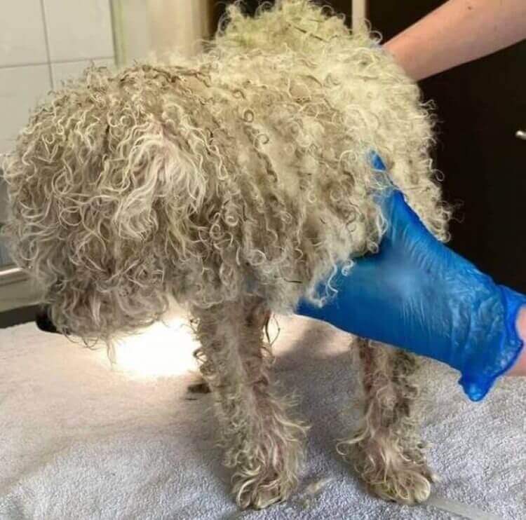 Além disso, seu canal auditivo também estava inflamado, e ele tinha muita dor para passar por um exame. Seu pelo estava muito sujo de fezes e urina. Seu rosto coberto pela pelagem, então ele não conseguia abrir os olhos. Segundo o médio, o cachorrinho ainda tinha sopro no coração, de grau 3/6.