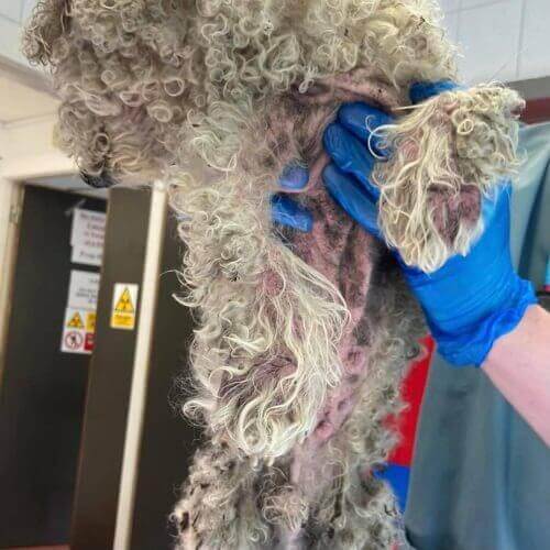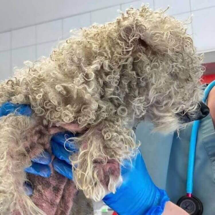 No entanto, após um check-up, confirmaram um estado de saúde muito mais delicado do que se via. “Este é um cachorro idoso, aproximadamente 12 anos de idade, com doença dentária grave, recessão das gengivas expostas. Sua pele, das patas aos ombros, estava gravemente inflamada”, diziam as notas do veterinário.