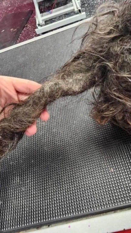 A equipe do abrigo entrou em contato com a The Downriver Grooming Co. para fazer uma sessão de emergência para ajudar o cachorro a escapar de sua prisão emaranhada. “Eles a receberam minutos depois de nossa ligação e passaram três horas libertando-a do pelo emaranhado”, escreveu o abrigo.