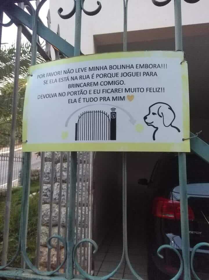 “Por favor! Não leve minha bolinha embora!!! Se ela está na rua é porque joguei para brincarem comigo. Devolva no portão e eu ficarei muito feliz!! Ela é tudo para mim”, diz a plaquinha.