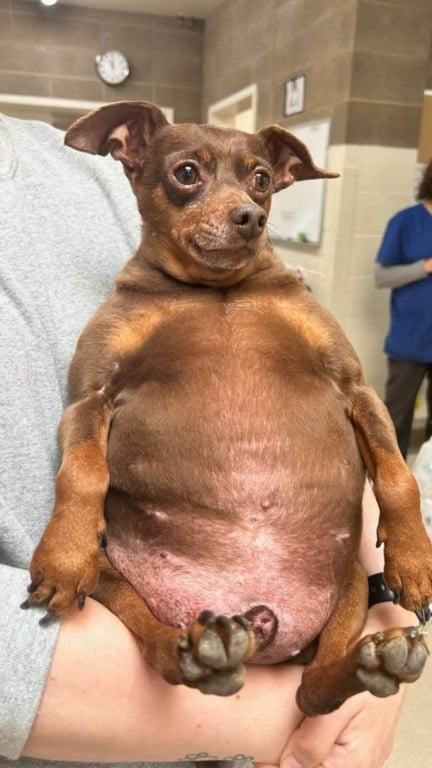 Jammy foi entregue ao abrigo pois seu tutor não tinha mais condições de cuidar dele. O pequeno cachorro pesava oito quilos, quando deveria pesar cerca de quatro e meio, e para um cão tão pequeno, isso é muito peso extra.