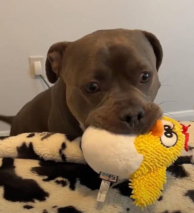 No fim da visita, Duke já parecia muito mais tranquilo. Em casa, o cachorrinho ganhou uma pelúcia de galinha, que agora carrega para todo lugar.
