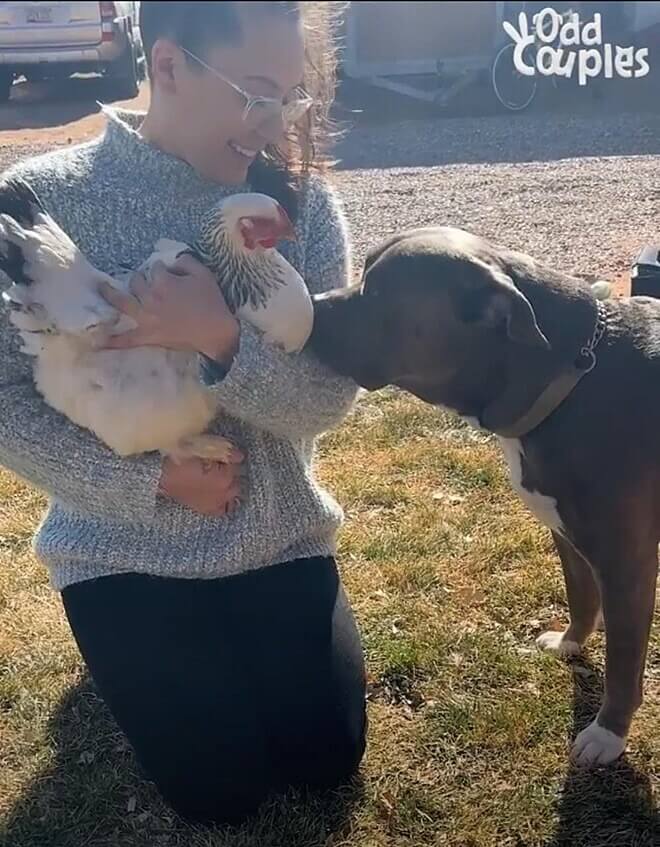 Como não pareceu funcionar, a tutora decidiu levar Duke até o local onde os pintinhos estavam. Agora, as aves já estavam entrando na fase adulta, mas assim que os viu, o sorriso do cachorro voltou quase que imediatamente.