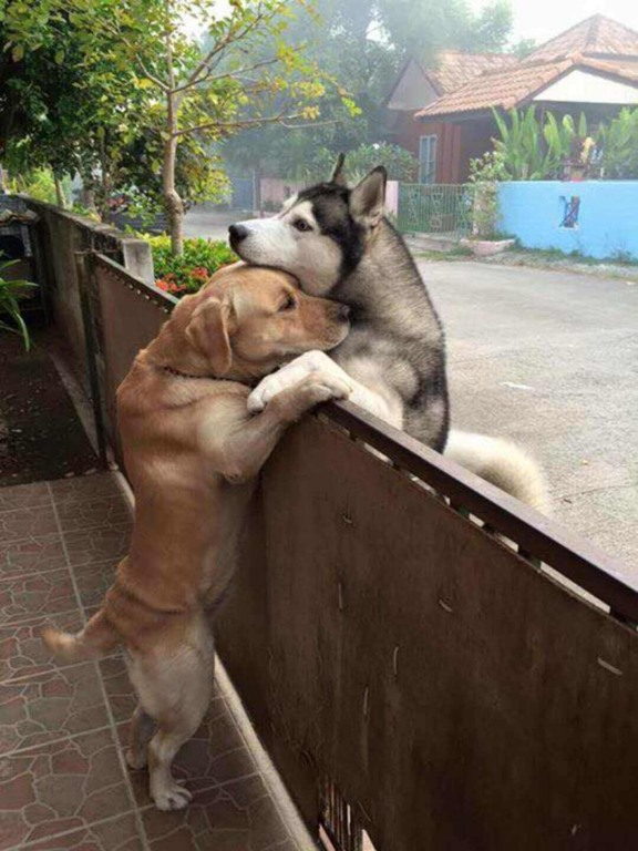 Em determinado dia, aparentemente os tutores de Audi deixaram o portão da casa destrancado e foram trabalhar. Assim, o husky que estava solitário viu uma chance de agradecer seu amigo. Oranit viu o momento em que Audi atravessou a rua e chegou à sua cerca. Messy, claro, estava lá para receber o cãopanheiro.