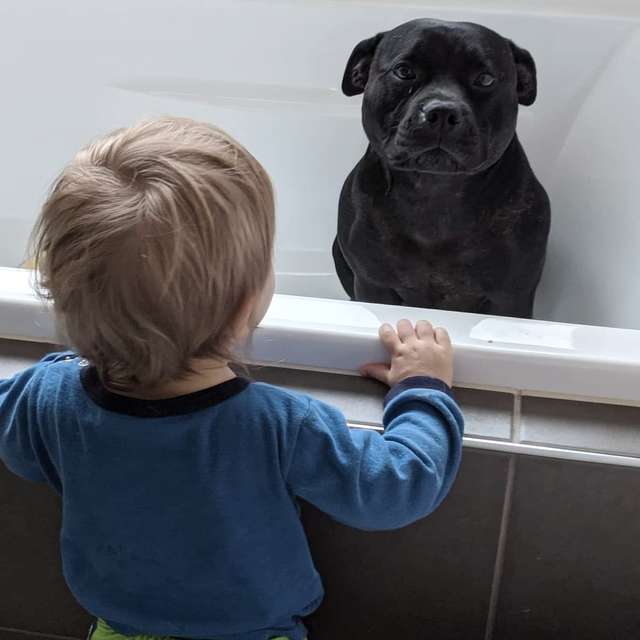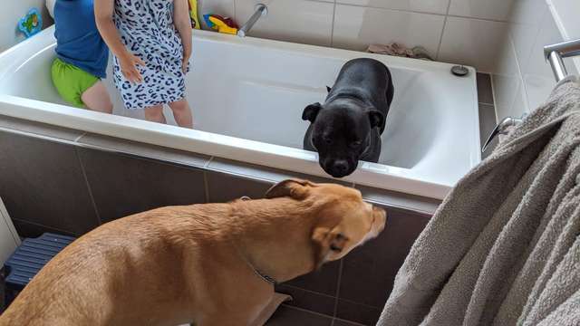 Cashew também vai participar do momento em família, mas apenas observando, ele passa bem longe da água.