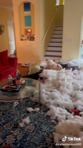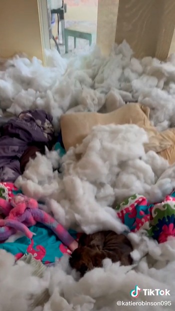 Aparentemente, Jazmine e Hazel decidiram que queriam ver o que exatamente estava dentro do pufe gigante que sua família tinha, e arrancaram absolutamente tudo dela. Robinson os encontrou inocentemente cochilando no meio de sua destruição. “Ela nem tenta arrancar o enchimento ou os guinchos de seus brinquedos, então o massacre do pufe foi inesperado”, disse Katie Robinson, mãe de Jazmine, ao The Dodo.