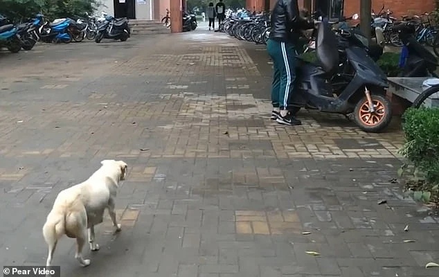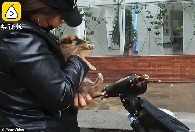 Enquanto a nova tutora do filhote o levava para sua lambreta, a cadelinha seguia atrás com orelhas abaixadas e cauda para baixo. A tutora baixou o pequeno para que sua mãe se despedisse.